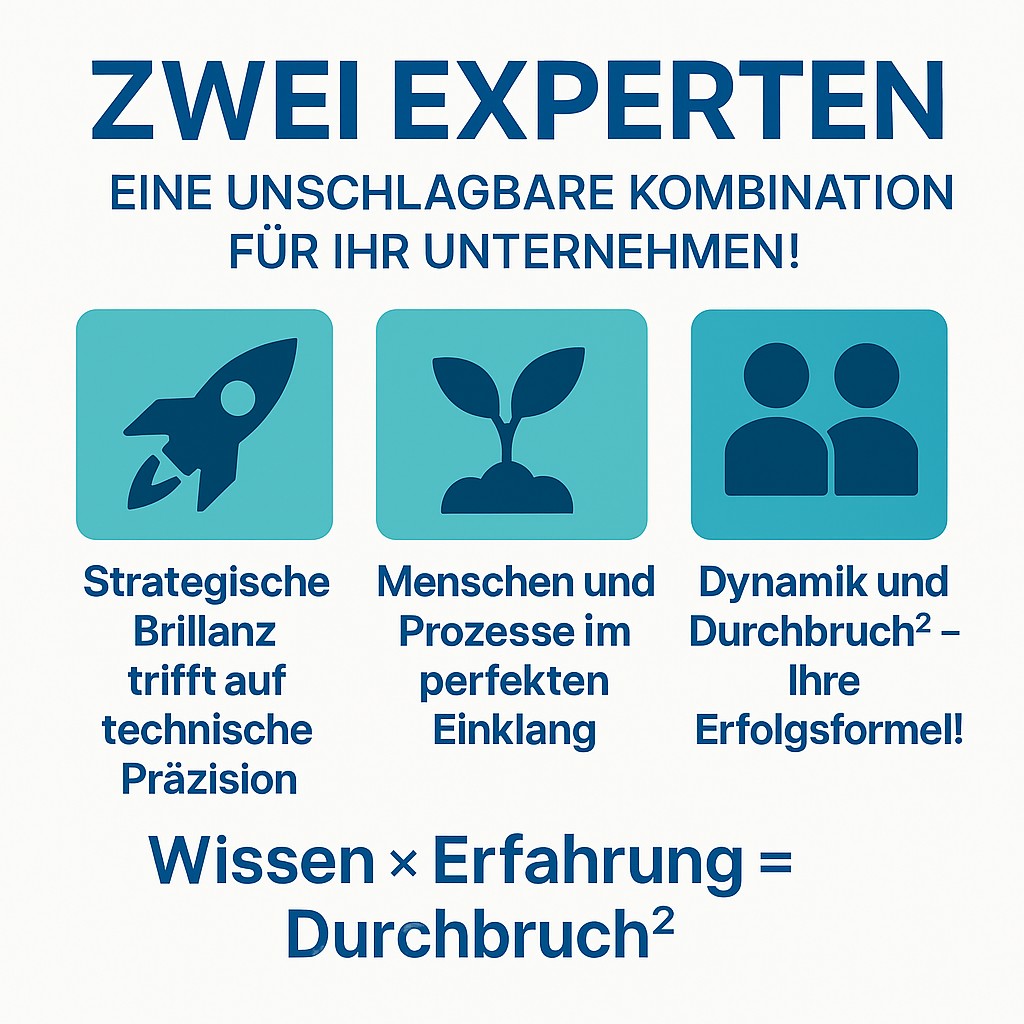 Sie liefern nicht nur Beratung, sondern eine Bewegung, die Unternehmen transformiert. Mit ihrer Formel Wissen × Erfahrung = Durchbruch² kombinieren sie analytische Präzision mit kreativer Innovationskraft – und schaffen damit Lösungen, die weit über klassische Unternehmensberatung hinausgehen.